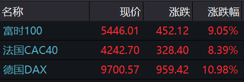 24日,欧洲主要股指全线跟涨,主流股指日涨幅均超过8%。截至收盘,英国富时100指数报5446.01点,涨9.05%;法国CAC40指数报4242.70点,涨8.39%;德国DAX指数报9700.57点,涨10.98%。