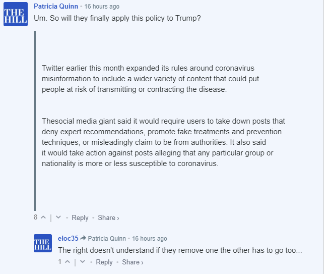 然而,在《国会山报》的报道下面,有网民就调侃说,如果推特真的按照这些人的定义和标准去删除赵立坚的网帖并封号,那特朗普的账号早就应该被封杀了……..