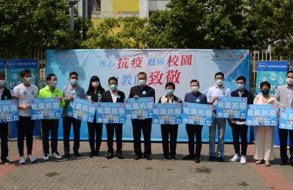【香港商報網訊】在九龍地域校長聯會、香港島校長聯會、新界校長會的支持下,全港社區抗疫連線日前於觀塘舉辦「齊心抗疫健康校園向老師致敬」活動啟動儀式,向聖言中學贈送500個口罩及200支消毒搓手液,又宣布將設立線上及線下抗疫物資申請渠道,以解各院校燃眉之急。
