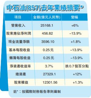 期內,集團收入按年增6%至2.5萬億元。主要原因是大部分油氣產品銷售量增加及價格下降綜合影響。去年原油平均實現價格為每噸3162元,按年跌1.6%。天然氣平均實現價格為每千立方米1313元,按年跌4%。