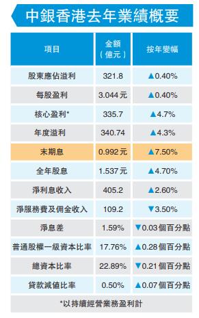截至去年12月底止,中銀香港全年多賺0.4%至321.84億元,末期息0.992元,全年股息1.537元,按年增加4.7%,全年派息比率50.5%。平均股東權益回報率11.51%。展望未來派息比率,中銀香港財務總監隋洋預計,區間將介乎40%至60%,並強調該水平合理恰當。