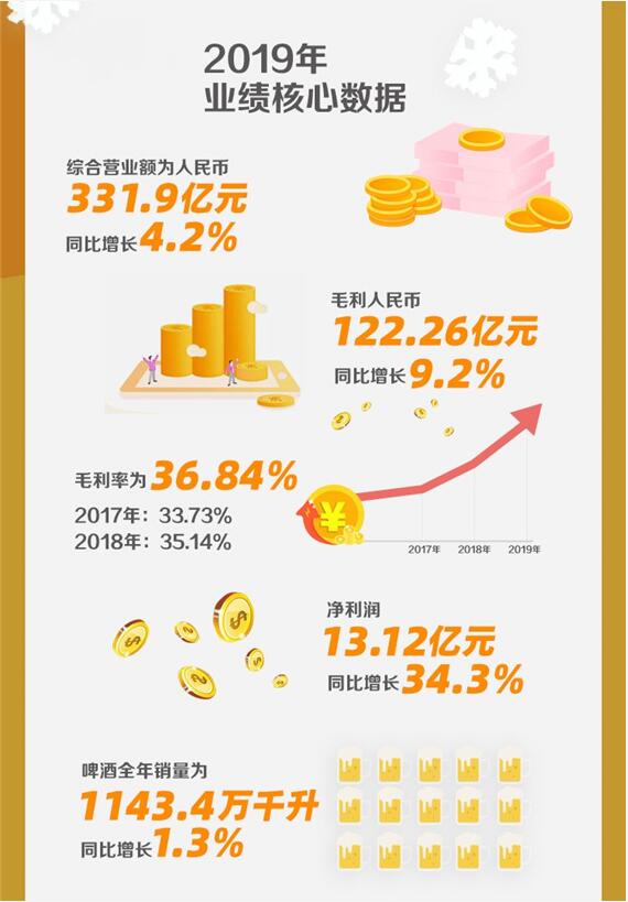 報告顯示,截止2019年12月31日,華潤啤酒綜合營業額為人民幣331.9億元,按年增長4.2%,股東應占綜合溢利大幅增長34.3%至人民幣13.12億元,未計利息及稅項前盈利按年增長47.6%至人民幣21.63億元。2019年毛利(進銷差價)為人民幣122.26億元,同比增長9.2%。