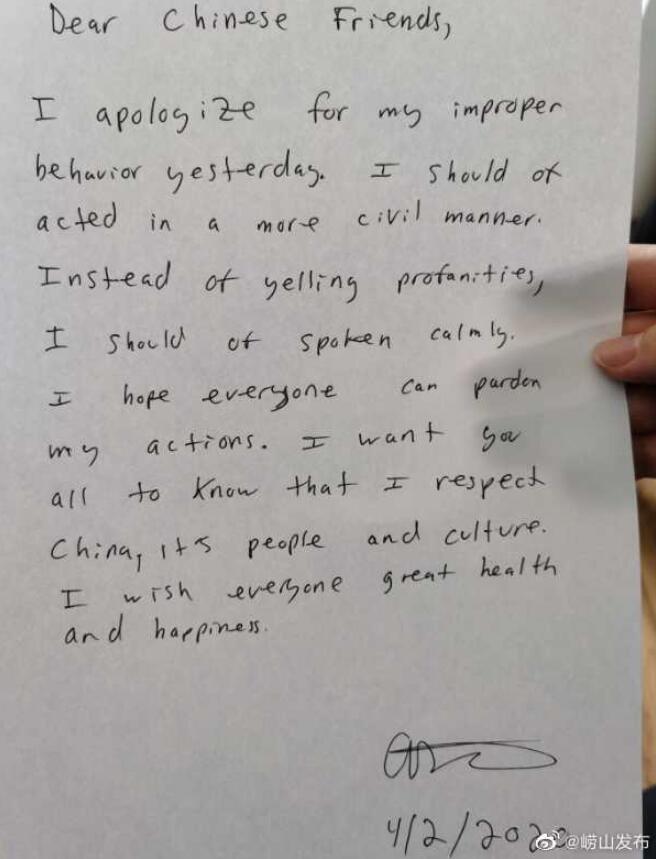 对此,崂山区公安机关连夜调查核实,并于4月2日上午会同相关部门,对涉事外籍当事人依法依规进行批评教育,警示其要严格遵守中国法律,自觉遵守社会公共秩序,执行疫情防控有关规定。当事人对此表示诚恳接受,并就其不当言行向公众致歉。