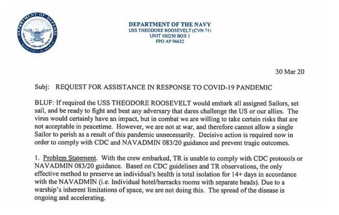3月31日《旧金山纪事报》独家获得并发表了该信。美国国防部长埃斯珀同日还称,他认为目前没有到撤离人员的地步。但美国海军部代理部长莫德利当地时间4月1日表示,“罗斯福”号已经有1000名船员撤到岸上,另外2700船员预计会在星期五前上岸。