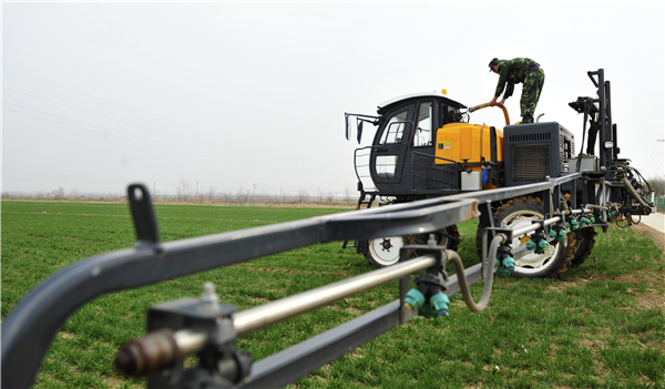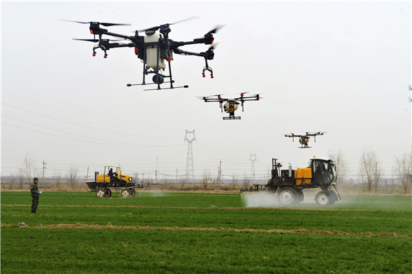 「渤海糧倉」忙春耕。合作社工作人員利用植保無人機和噴霧機在河北省泊頭市四營鄉黃屯村麥田內作業。新華社