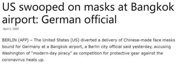 柏林市政府負責內務的官員安德烈亞斯•蓋澤爾在一份聲明中說,20萬隻「非常搶手」的FFP2口罩在曼谷被「攔截」。這些口罩由一家在中國的美國企業生產、原本計劃運往柏林供當地警方使用。聲明說:「目前,我們認為這一事件與美國政府對口罩的出口禁令有關。在全球面臨危機的此刻,也不能用『狂野西部』的方式。」