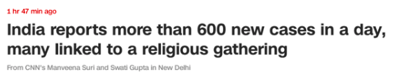 CNN援引印度衛生部門一名高級官員的話說,該國病例近期出現激增,與3月在新德里清真寺舉行的一場宗教聚會有關。報道稱,當時來自印度各地和海外的人們聚集在一起參加了這次聚會。
