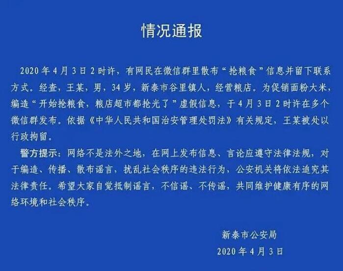 【香港商报网讯】山东新泰一男子为促销面粉大米,编造“开始抢粮食、粮店超市都抢光了”虚假信息被依法行政拘留。