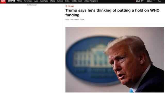 【香港商报网讯】美国有线电视新闻网(CNN)消息,当地时间7日,美国总统特朗普在白宫的每日新冠疫情简报会上宣称,将“强有力地阻止”美国向世界卫生组织(World Health Organization)提供资金,因为该组织持有“以中国为中心”的立场。但CNN报道说,特朗普在随后不久态度又有所退让。