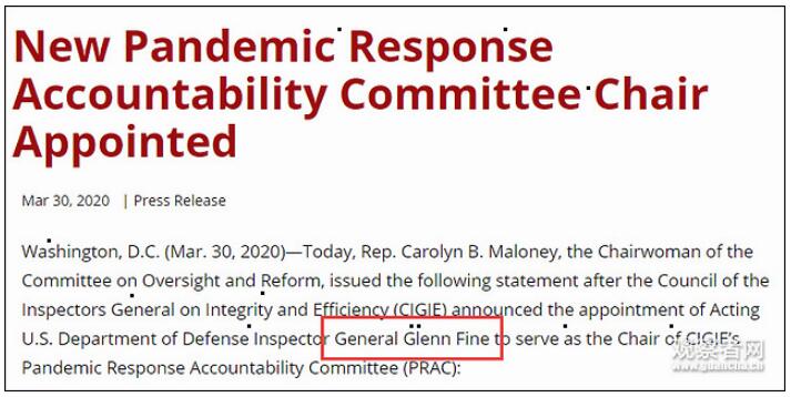 上月,在美国国会通过2.2万亿美元经济刺激法案后,成立了由10名监察长组成的新冠肺炎救济法案督察小组,目的是审计和调查法案的执行情况。3月30日,白宫在其官网转发国会声明,五角大楼监察长格伦·费恩将为新冠肺炎救济法案督察小组组长。