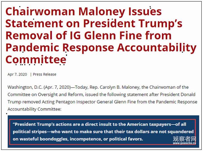 但仅仅一个多星期后,格伦·费恩就被白宫解职。这也意味着同时他将不再领导新冠肺炎救济法案督察小组,不能继续监督白宫执行“2万亿美元法案”。