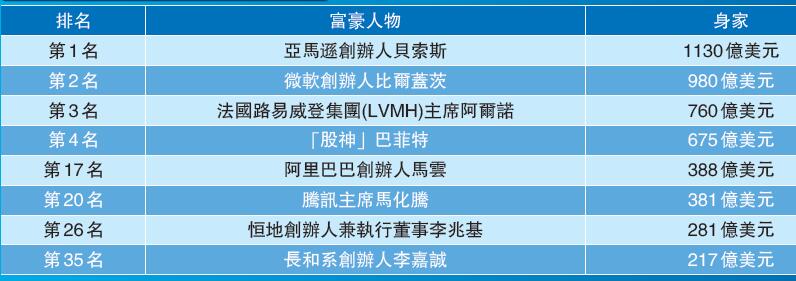 亞馬遜創辦人貝索斯(Jeff Bezos)以1130億美元連續3年穩坐榜首,但身家較去年少180億美元。第二名是微軟創辦人比爾蓋茨,身家980億美元,按年增長15%。第三名由法國路易威登集團(LVMH)主席阿爾諾奪得,身家760億美元,「股神」巴菲特排名下跌一級至第四,身家675億美元,按年縮水150億美元。