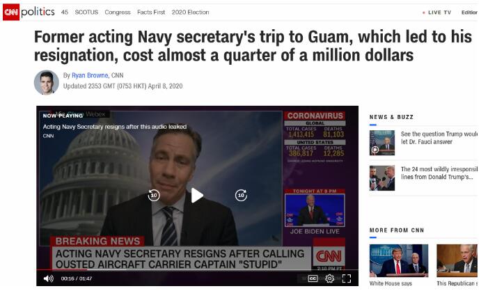 CNN援引一名美国海军官员的话称,莫德利周一(6日)前往关岛,向“罗斯福”号航母船员发表讲话,并斥责他们的前任舰长克罗泽。该官员透露,这次关岛之行花费了24.3万美元。