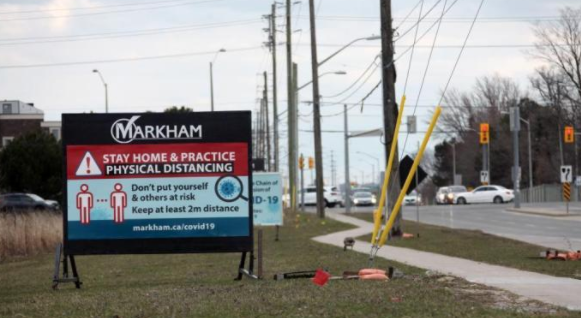 当地时间4月11日,复活节假期,加拿大大多伦多地区万锦市公路边竖有醒目的告示牌,提醒民众注意保持物理距离,防止病毒传播。中新社记者 余瑞冬 摄