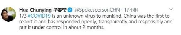 “新冠病毒对人类来说是一种未知病毒。中国最先报告,公开、透明且负责任地做出响应,并在大约两个月内控制了局势。”华春莹首先写道。
