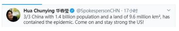 “有着14亿人口和960万平方公里土地的中国已经控制了疫情。美国加油,保持强大!”她还写道。
