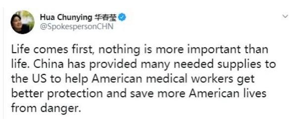在此之前,华春莹还在推特上提到了中方为美国抗疫提供了援助。“生命第一,没有任何事比生命更重要。中国为美国提供了必要物资,以帮助美国医务工作者获得更好的保护,从危险中拯救更多美国人的生命。”