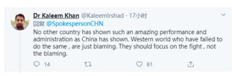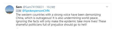 “西方国家的声音很强烈,一直妖魔化中国,这很离谱!这是在破坏世界和平。无视事实只会让疫情夺走更多的生命!这些满腹偏见的可耻政客应该下地狱!”