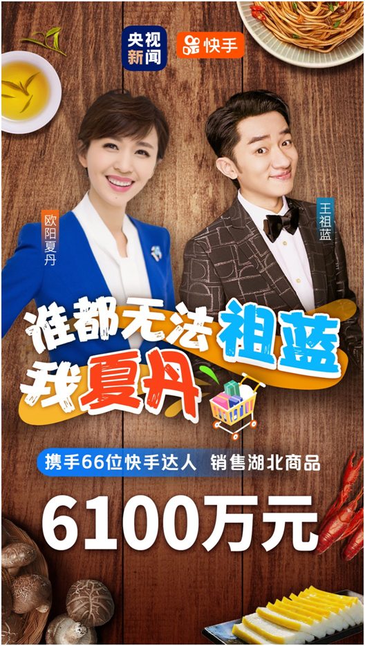 12号晚上20点到22点,快手联合央视新闻举办公益直播活动,售卖湖北商品。央视主持人欧阳夏丹化身“带货官”与演员王祖蓝组成“谁都无法祖(阻)蓝(拦)我夏(下)丹(单)”组合在快手上演了带货首秀。直播过程中,更有十堰市副市长王晓、演员郑爽、演员蔡明以及快手带货达人娃娃和蛋蛋空降直播间。