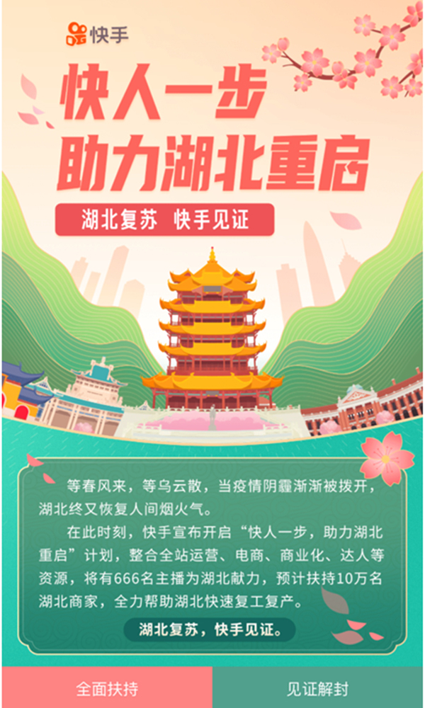 在与央视联合开展公益卖货活动的同时,快手近日还宣布开启“快人一步,助力湖北重启”计划,预计将有666名主播为湖北献力扶持10万名湖北商家,全力帮助湖北快速复工复产。