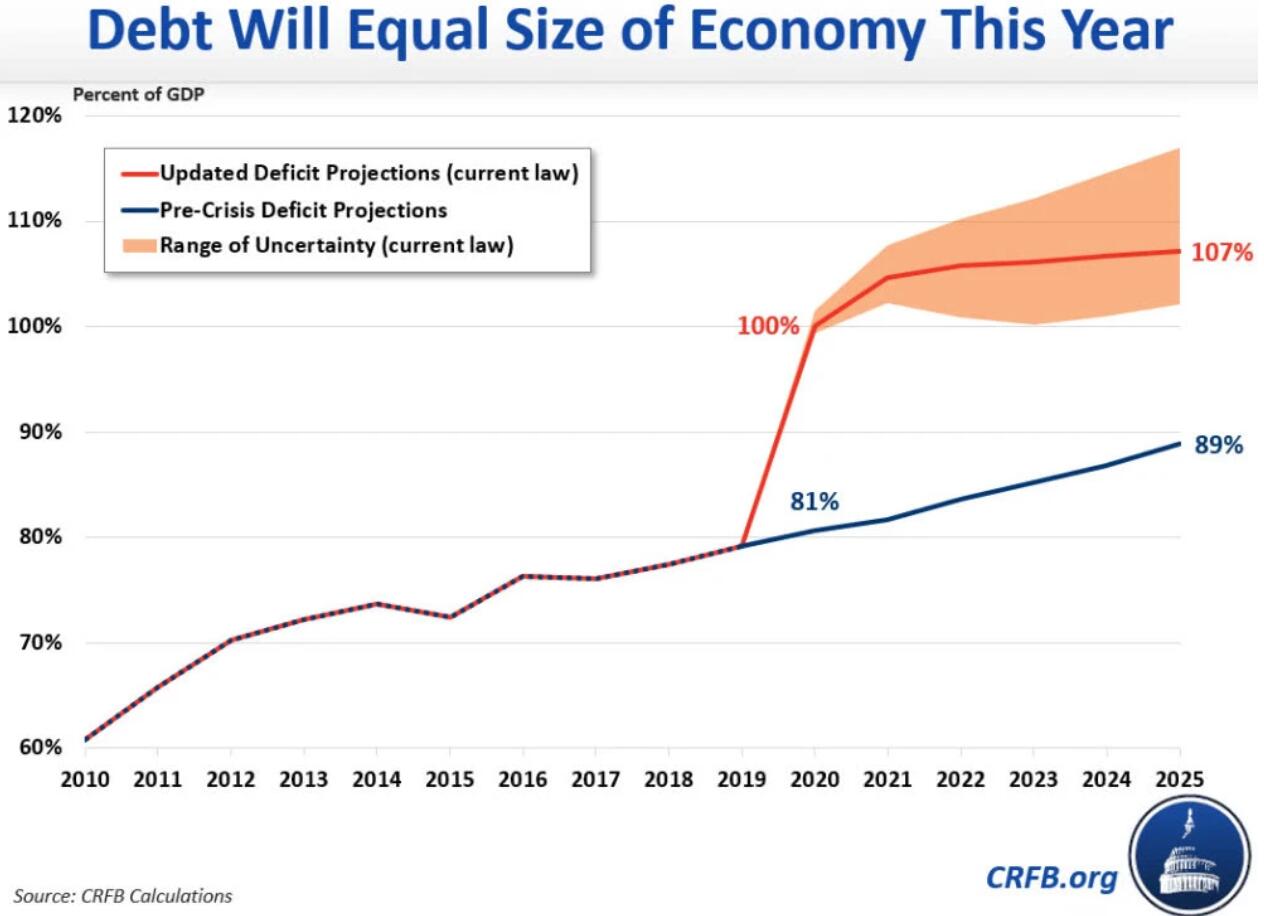 为了应对疫情的冲击,美国先后通过多轮经济救助法案,缓和了资本市场恐慌,提振了经济预期,但是却造成了政府赤字的大幅上升。跨党派的公共政策机构“负责任的联邦预算委员会(Committee for a Responsible Federal Budget)”13日发表报告预测,美国财政赤字和债务水平将达到二战以来的最高水平。