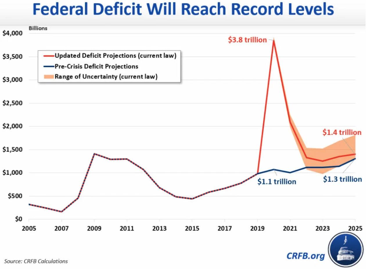 根据现行法律,美国联邦政府今年的预算赤字总额将超过3.8万亿美元(占GDP的18.7%,是上一财年的4倍),到2021年将为2.1万亿美元(占GDP的9.7%)。