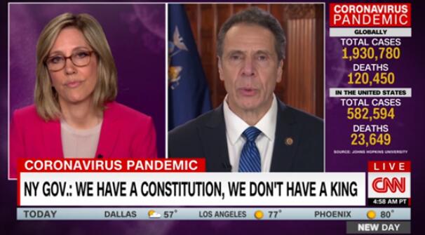 而在接受美国有线电视新闻网(CNN)采访时,科莫则直截了当地说:“我们有的不是国王特朗普,而是总统特朗普。”此外,他还警告说,如果白宫要求纽约强行重启经济,将会造成几十年未见的“宪政危机”。