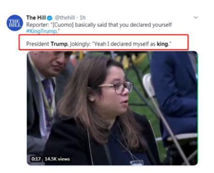 在当地时间14日晚召开的白宫疫情简报会上,记者也就科莫的这番嘲讽特朗普宣布自己是“国王”说辞提问了特朗普。