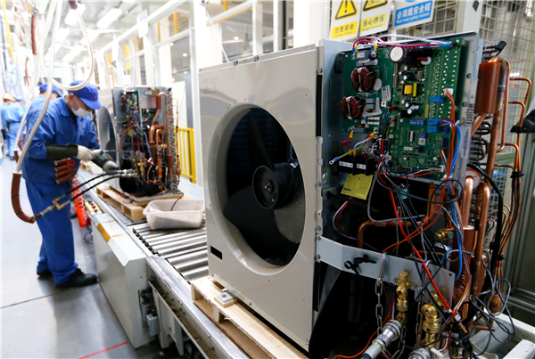 目前,山東青島市即墨區 646家外資企業訂單生產工作正有序開展。圖為三菱重工海爾(青島)空調機有限公司工人在生產線上忙碌。新華社