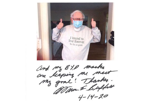 【香港商報網訊】新冠肺炎美國確診人數及死亡人數都是全球最高。一度被視為是「股神」巴菲特(Warren Buffett)接班人的李祿,今日在社交平台上載一張巴菲特戴上口罩的相片,身穿的上衣印上「我想長命百歲,目前為止還不錯」,又在照片寫上「我的比亞迪口罩正幫我達到目標,謝謝」。