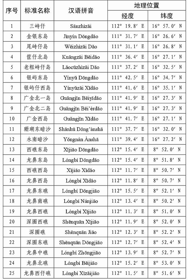 公告称,为进一步规范有关地名的使用,现将我国南海部分岛礁和海底地理实体的标准名称予以公布。中国地名委员会1983年4月受权公布的《我国南海诸岛部分标准地名》继续有效,请社会各界规范使用已公布的标准名称。