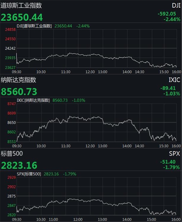 道指收盘下跌592.05点,或2.44%,报23650.44点;纳指跌89.41点,或1.03%,报8560.73点;标普500指数跌51.40点,或1.79%,报2823.16点。
