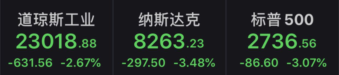 道指收盘下跌631.56点,或2.67%,报23018.88点;纳指跌297.50点,或3.48%,报8263.23点;标普500指数跌86.60点,或3.07%,报2736.56点。