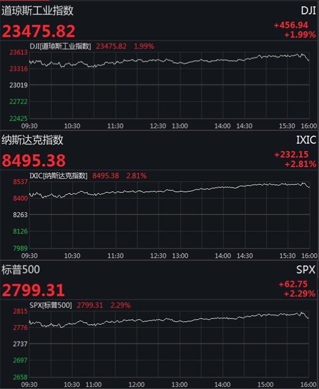 道指收盘上涨456.94点,或1.99%,报23475.82点;纳指涨232.15点,或2.81%,报8495.38点;标普500指数涨62.75点,或2.29%,报2799.31点。