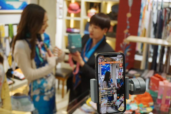 圖為主播在上海豫園商城中直播展示中國本土品牌絲巾。新華社
