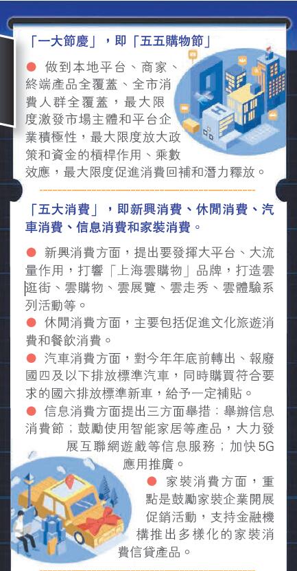 【香港商報网訊】上海昨日發布《關於提振消費信心強力釋放消費需求的若干措施》(下稱《措施》),提出12條政策舉措,?力提振消費信心、釋放消費需求。這些措施包括舉辦貫穿勞動節、兒童節、端午節等多個重點節日的「五五購物節」;發力網絡購物等新興消費、餐飲等休閒消費,以及汽車消費、信息消費和家裝消費;繼續發揚首發經濟、夜店經濟、品牌經濟和免退稅經濟的亮點特色等。