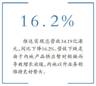 维达一季度实现净利润3.77亿港元,同比增加64.8%;净利润率达11%,同比增长5.4%;经营溢利为5.27亿港元,同比增加55%;经营利润率为15.4%,上升7.1%;息税折旧摊销前溢利为8.11亿港元,同比增长32.1%;息税折旧摊销前溢利率增长至23.7%。