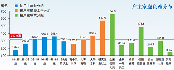 調查數據顯示,城鎮居民家庭總資產均值為317.9萬元,中位數為163.0萬元。均值與中位數之間相差154.9萬元,表明居民家庭資產分布不均。分省份看,家庭資產最高的三個省(自治區、直轄市)為北京、上海和江蘇,最低的三個省(自治區、直轄市)為新疆、吉林和甘肅。其中,北京居民家庭戶均總資產約為新疆居民家庭的7倍。