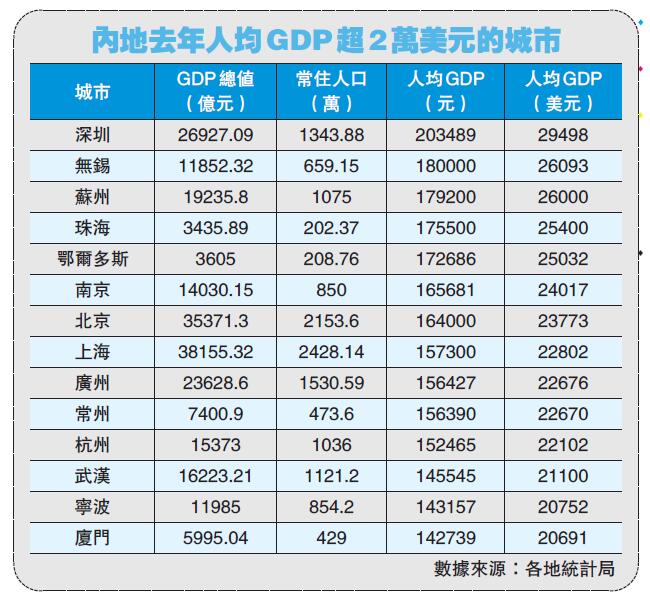 【香港商報网訊】人均GDP突破2萬美元這個數字,就意味着躋身發達經濟體俱樂部。而從2019年的數據看,中國內地有14座城市跨過了這一門檻,覆蓋超1.4億人口。