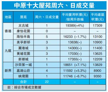 中原地產十大屋苑本周末共錄得22宗成交,按周增加5宗或29.4%,創2月底以來7星期新高,各個區份表現平均,當中9個指標屋苑均錄得成交,海怡半島及嘉湖山莊成交最多,分別佔5宗及4宗;美孚新邨、麗港城及黃埔花園各錄得3宗。