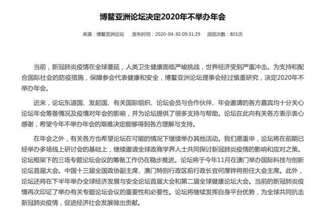 【香港商报网讯】据中新社国是直通车获悉,博鳌亚洲论坛30日正式确认,2020年不举办年会。博鳌论坛称,当前,新冠肺炎疫情在全球蔓延,人类卫生健康面临严峻挑战,世界经济受到严重冲击。为支持和配合国际社会的防疫措施,保障参会代表健康和安全,博鳌亚洲论坛理事会经过慎重研究,决定2020年不举办年会。