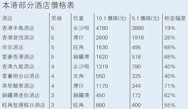 以四星級酒店為例,位於跑馬地的英皇駿景酒店5月1日的價格低至344元,而10月1日則為1170元,兩者之間差距高達71%。三星級酒店方面,銅鑼灣迷你酒店在以上兩個日期的價格差距為62%,單看相差幅度不算最大,但由於本來單價就比較低,因此該酒店經調整後單價竟低至172元,可謂真正的「白菜價」。