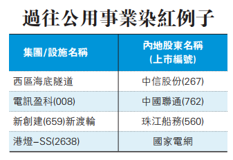 近年本地公用事業企業不時獲得內地資金入股,例如1997年啟用的西區海底隧道。西隧的建造、維修和營運均由香港西區隧道有限公司承擔。而西隧公司的目前幾大股東中,中信股份(267)(前稱:中信泰富)和嘉里建設(683),透過聯營公司分別持有西隧公司35%及15%的權益。