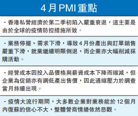 IHSMarkit指,面對因遏止新冠肺炎的限制措施,企業惟有暫時休業或轉以較低產能營運,導致香港私營經濟於4月繼續承受沉重壓力。企業的業務量和新訂單量持續急跌,就業與採購活動同時遞減。至於供應商交貨的履行時間,則因供應鏈失衝而備受牽累。價格方面,整體進一步下調;而企業的營商情緒,亦仍然非常悲觀。