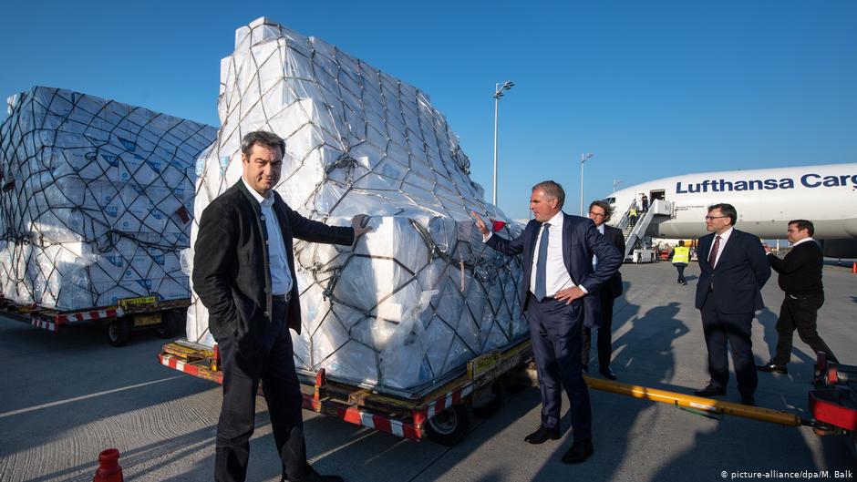 巴伐利亞州長瑟得爾與漢莎航空董事長施波爾4月7日在慕尼黑機場親自迎接一批從上海運來的口罩。(德國之聲)