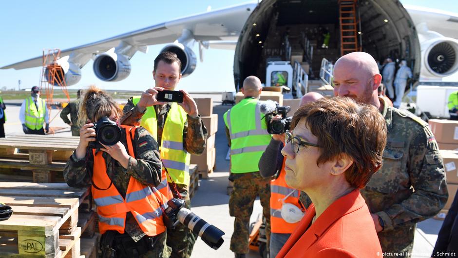 德國國防部長克朗普-卡倫鮑爾4月27日在萊比錫機場親自迎接1000多萬枚來自中國的口罩。(德國之聲)