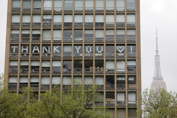 5月6日是美國國家護士日,紐約一家醫院的窗口寫有多謝醫護的字句。 路透社