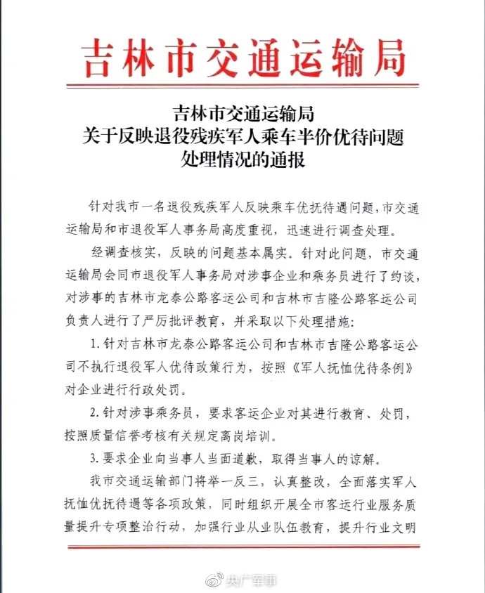 【香港商报网讯】5月4日,一名网友上传了一段视频。内容主要是:吉林一伤残军人乘坐大客车时拿出《残疾军人证》买半价票遭拒,乘务员还辱骂道:“活不起你就别活”。5月7日,吉林市政府新闻办公室官方微博发布“关于反映退役残疾军人乘车半价优待问题处理情况的通报” 。通报称,将采取以下处理措施: