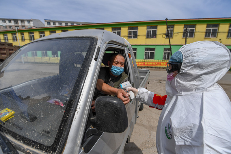 5月11日,在吉林省舒兰市一小区,工作人员为进出居民测温。 新华社