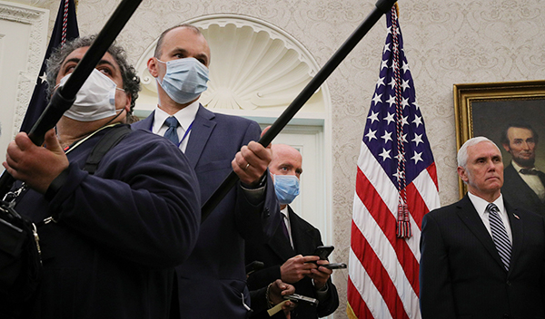 在白宮的記者會上,彭斯都沒有戴上口罩。資料圖片
